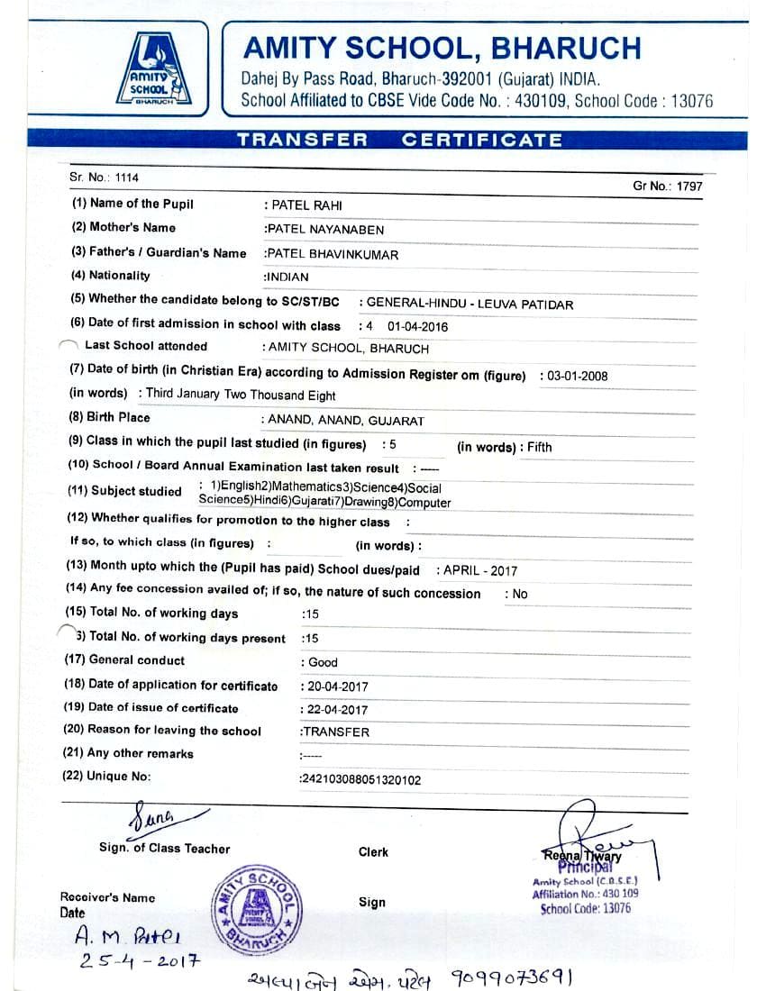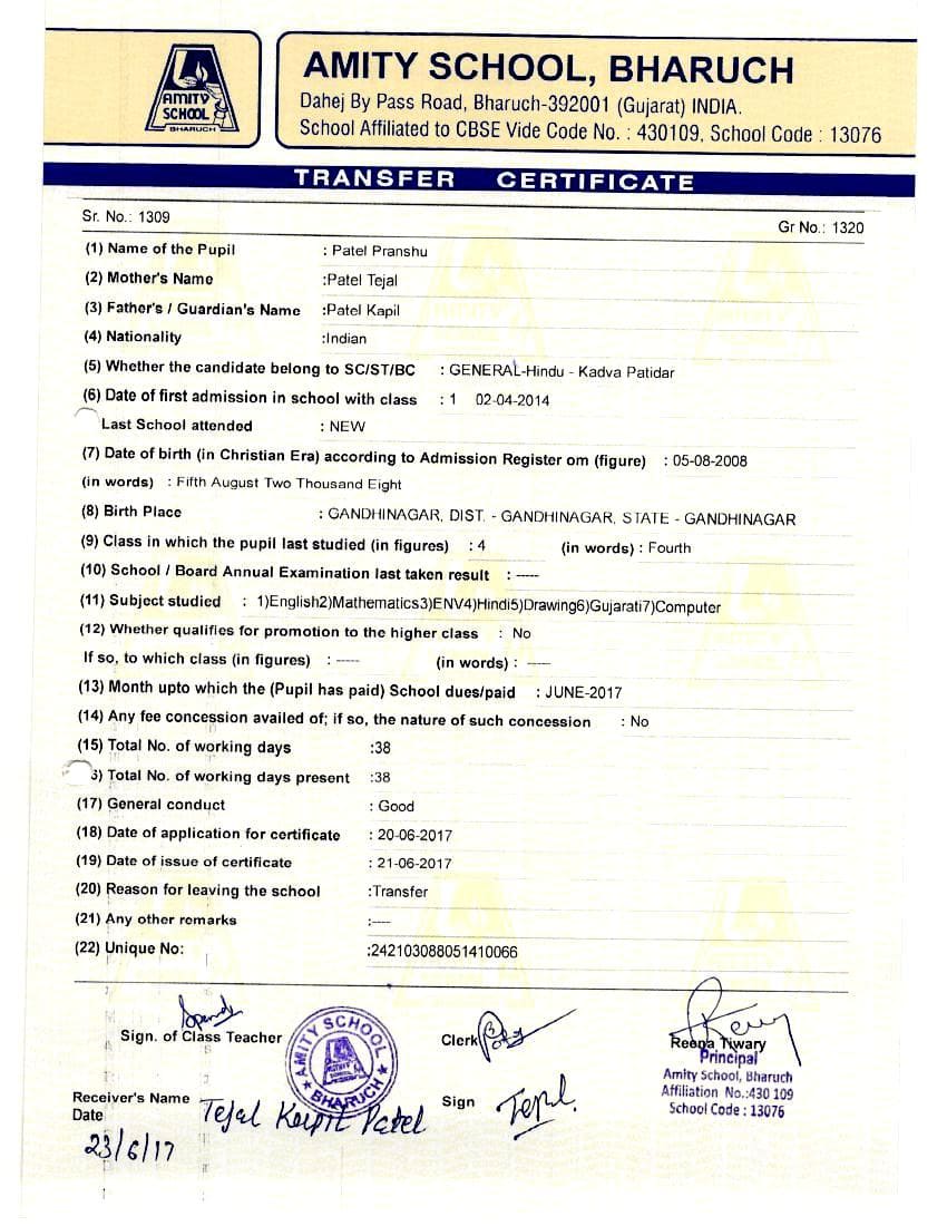 | HETANSHI SANJAYBHAI PATEL | 1 | Leaving Certificate |