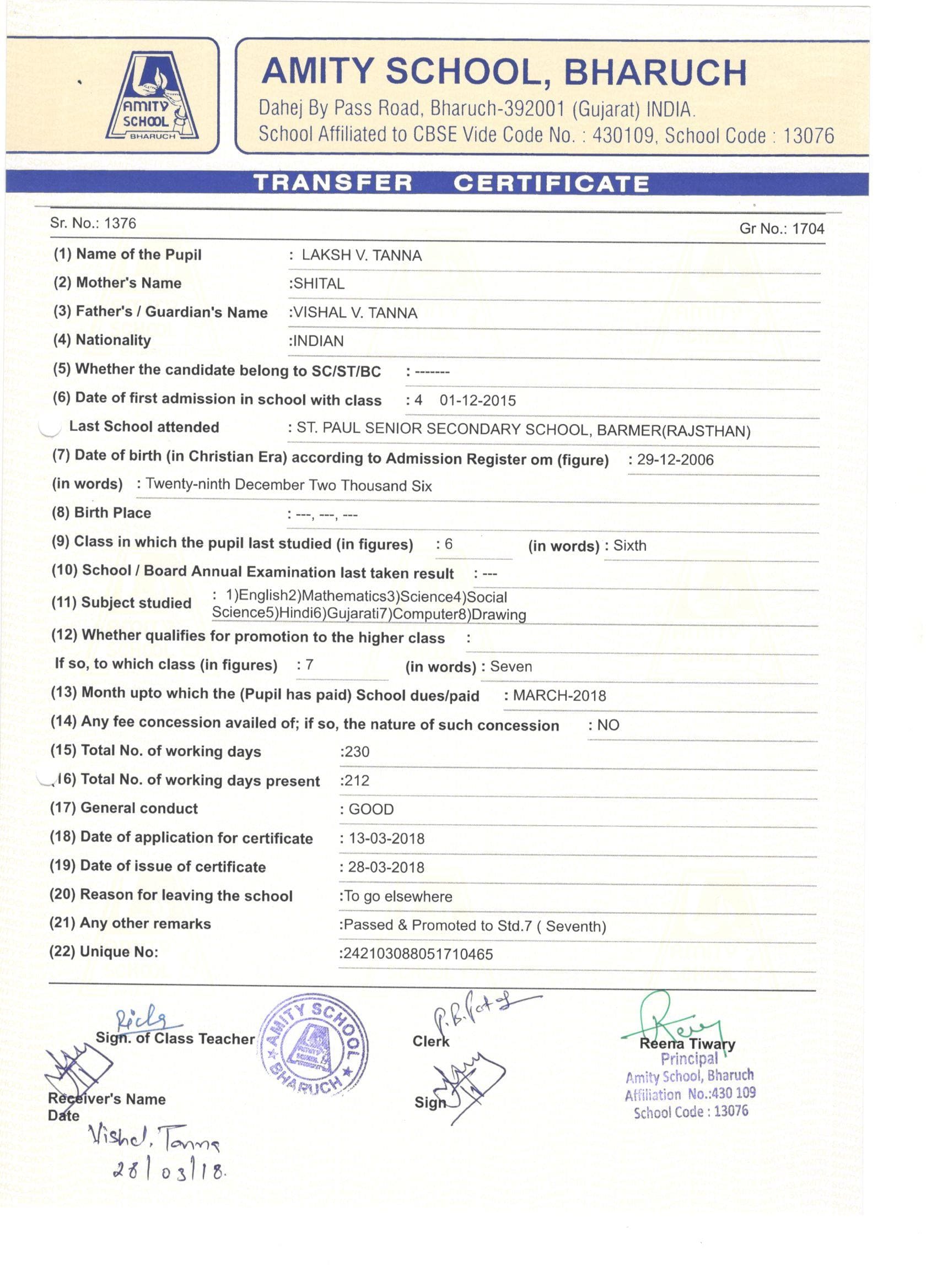 | LAKSH V TANNA | 6 | Leaving Certificate |