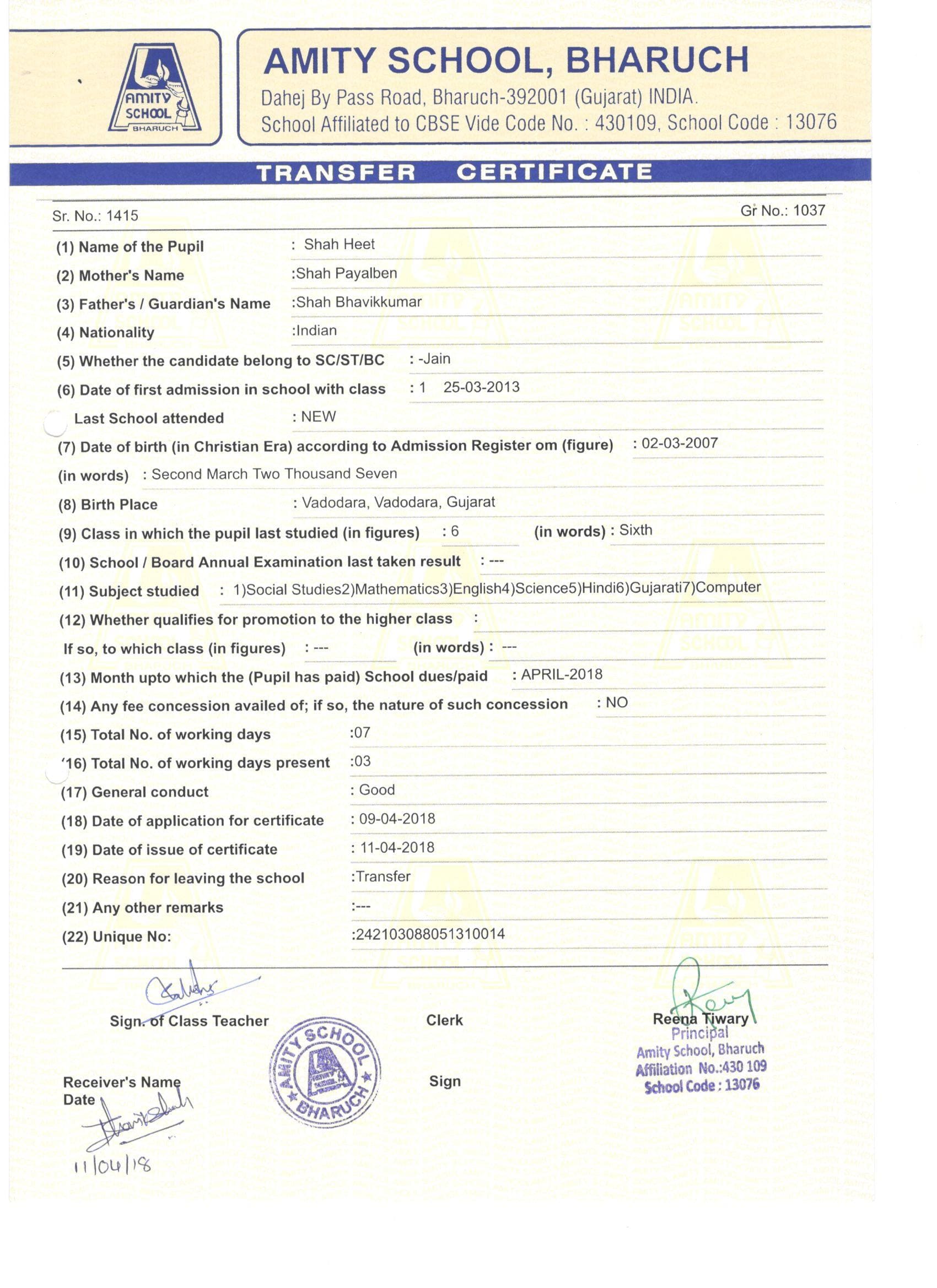 | HEET BHAVIKKUMAR SHAH | 6 | Leaving Certificate |