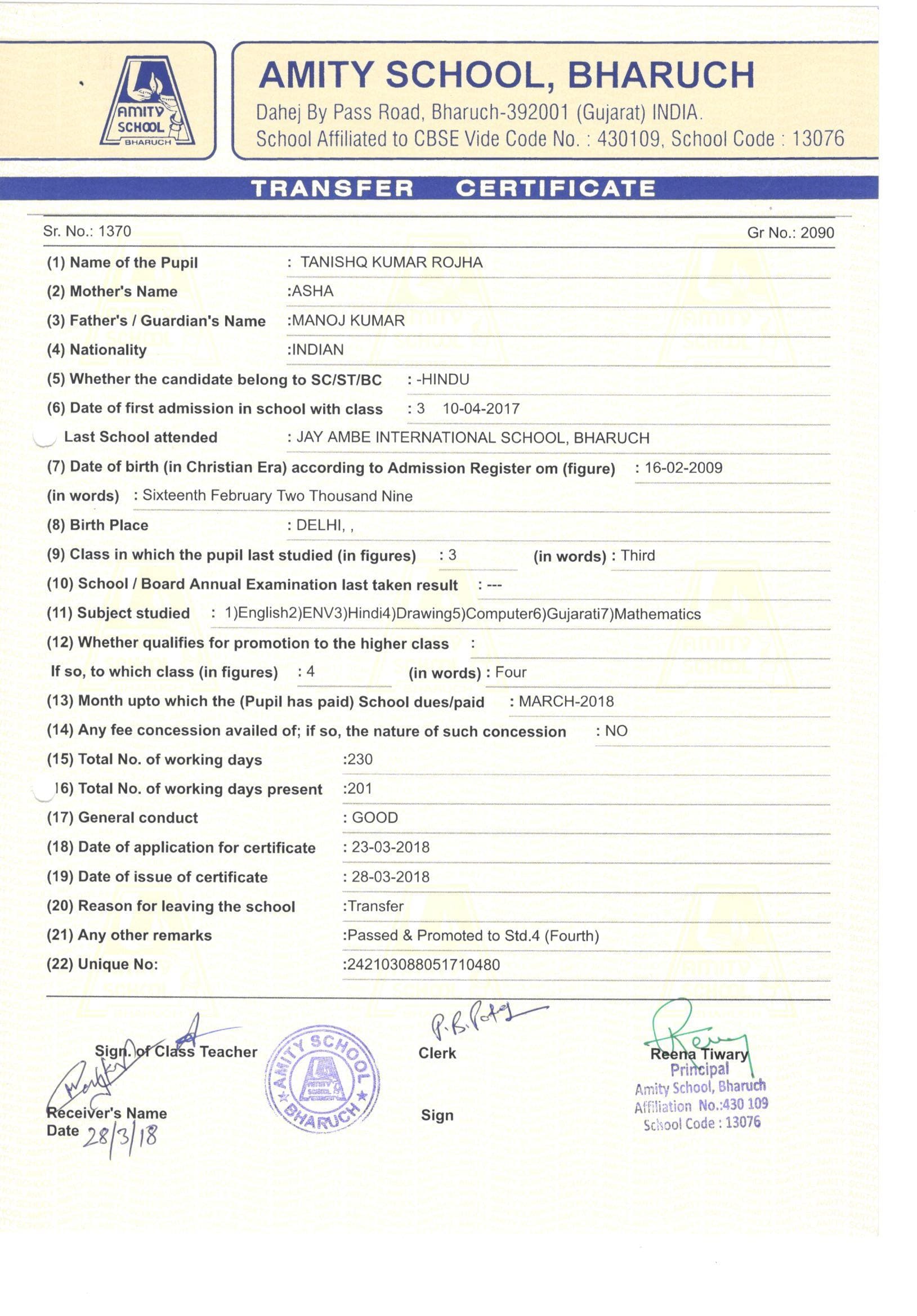 | TANISHQ KUMAR MANOJ KUMAR ROJHA | 3 | Leaving Certificate |
