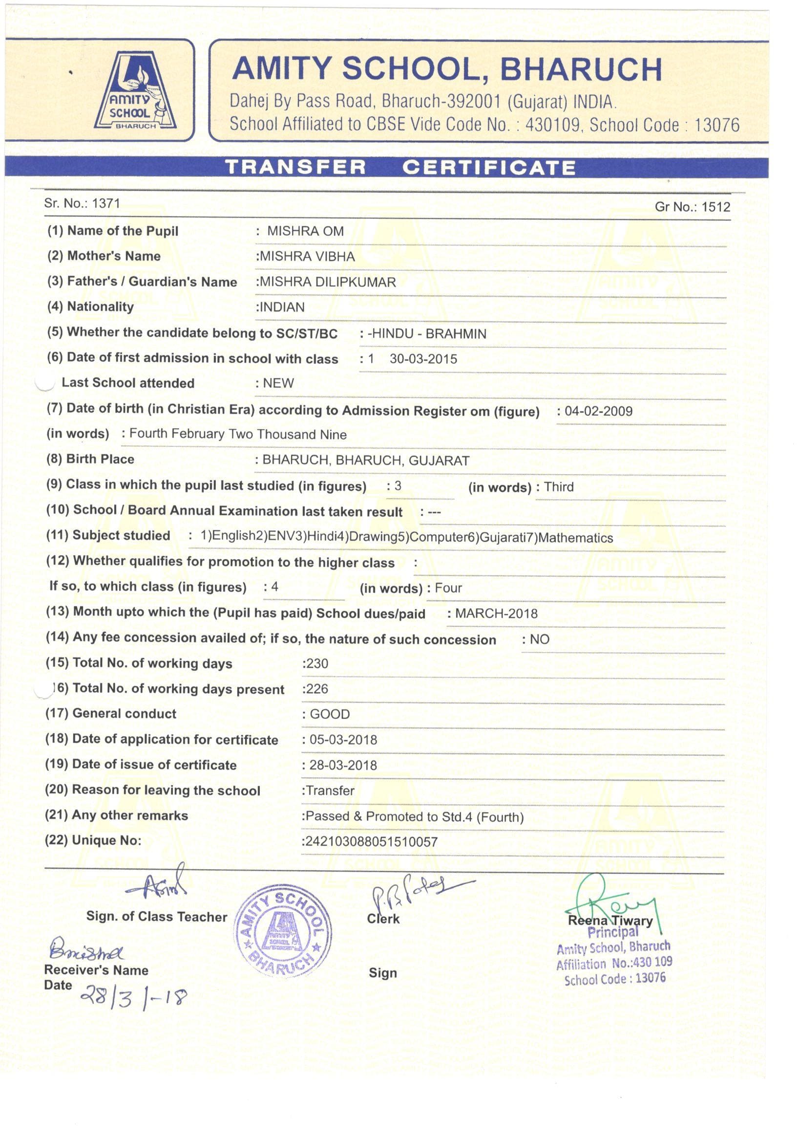 | OM DILIP KUMAR MISHRA | 3 | Leaving Certificate |