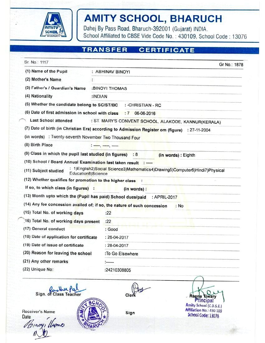 | ABHINAV BINOYI | 8 | Leaving Certificate |