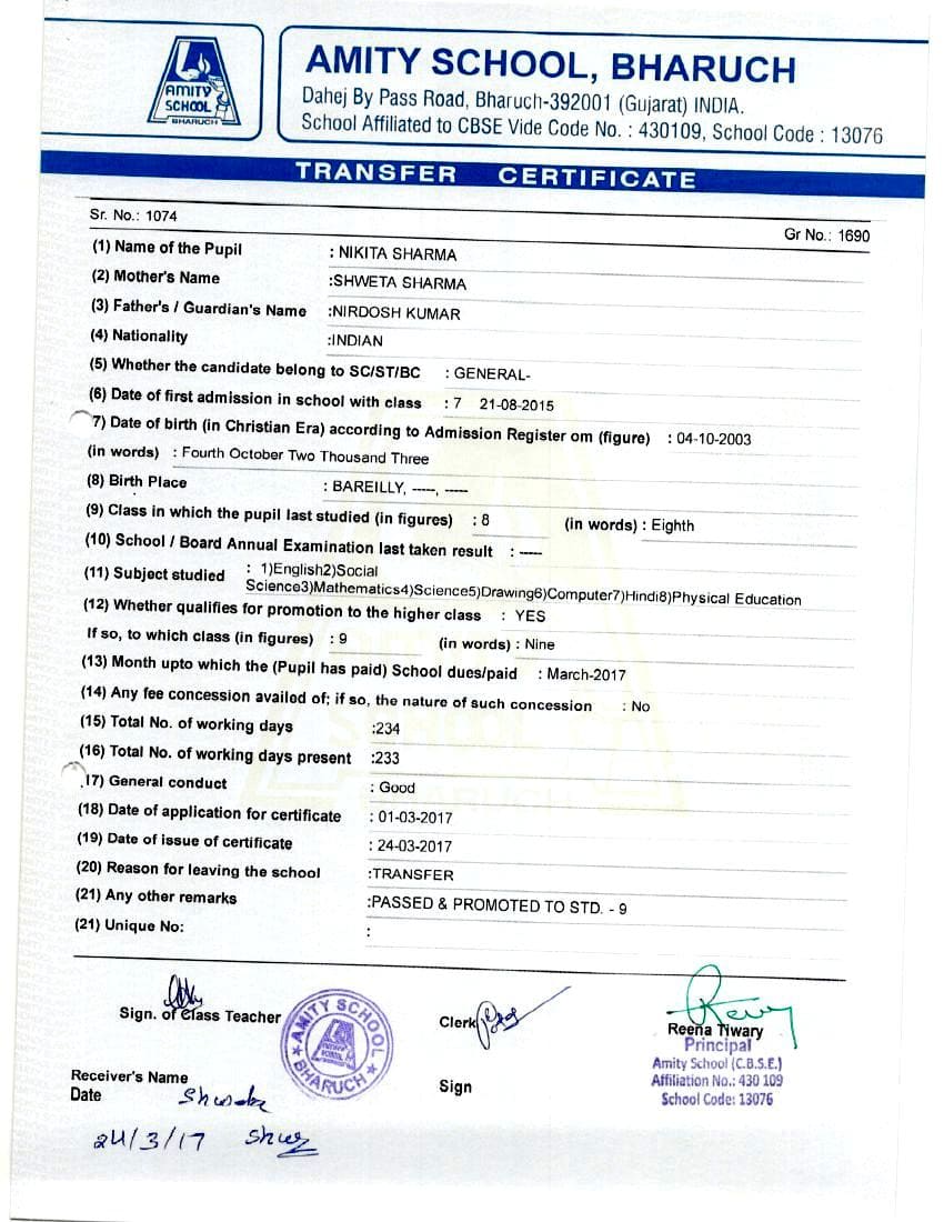 | NIKITA SHARMA | 8 | Leaving Certificate |
